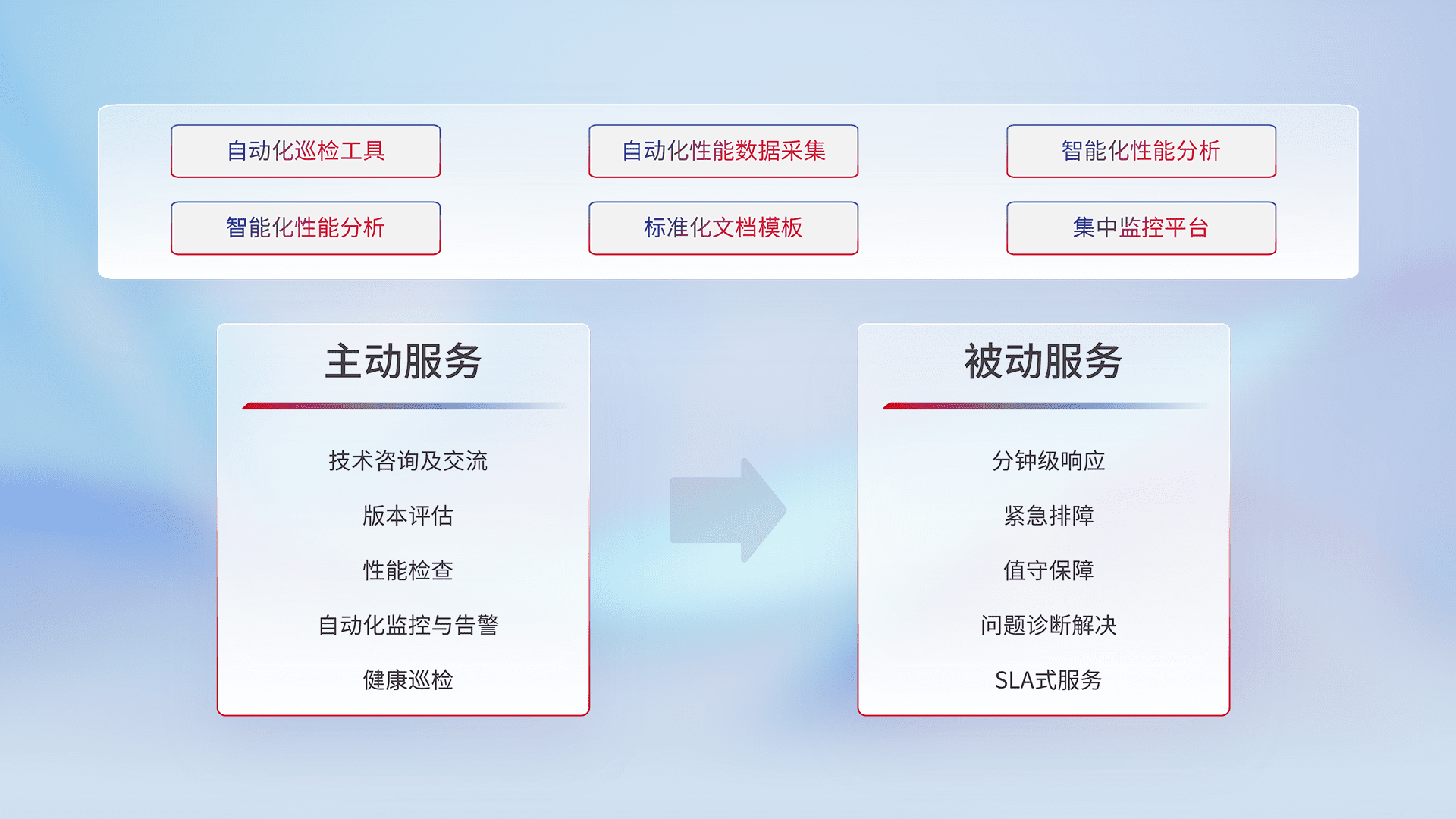 智能化工具和标准化文档,,保障服务质量,,,提供主动服务(包含技术咨询、、版本评估、、、、性能检查、、、自动化监控与告警、、、、健康巡检)和被动服务包含(分钟级响应、、、、紧急排障、、、、值守保障、、、、问题诊断解决、、、SLA服务)。。