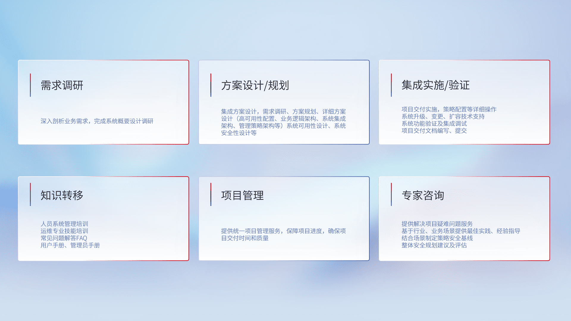 针对客户行业特性,,,将宏观的安全战略和需求,,,通过专业的交付服务,,,,实现项目落地,,为客户提供标准规范的集成交付服务。。